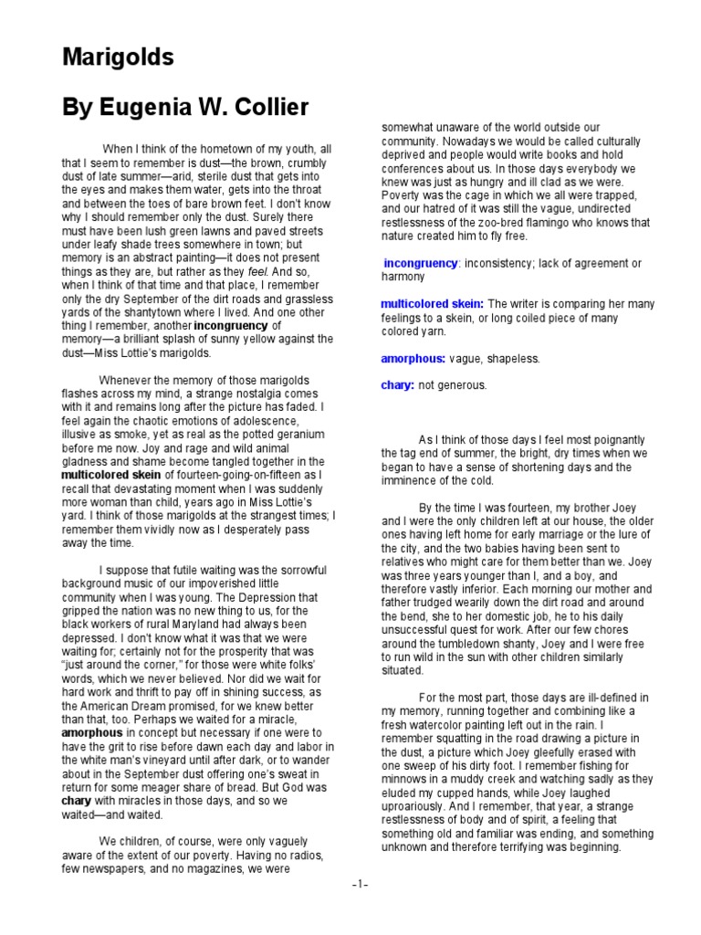Marigolds By Eugenia W Collier Incongruency Pdf
